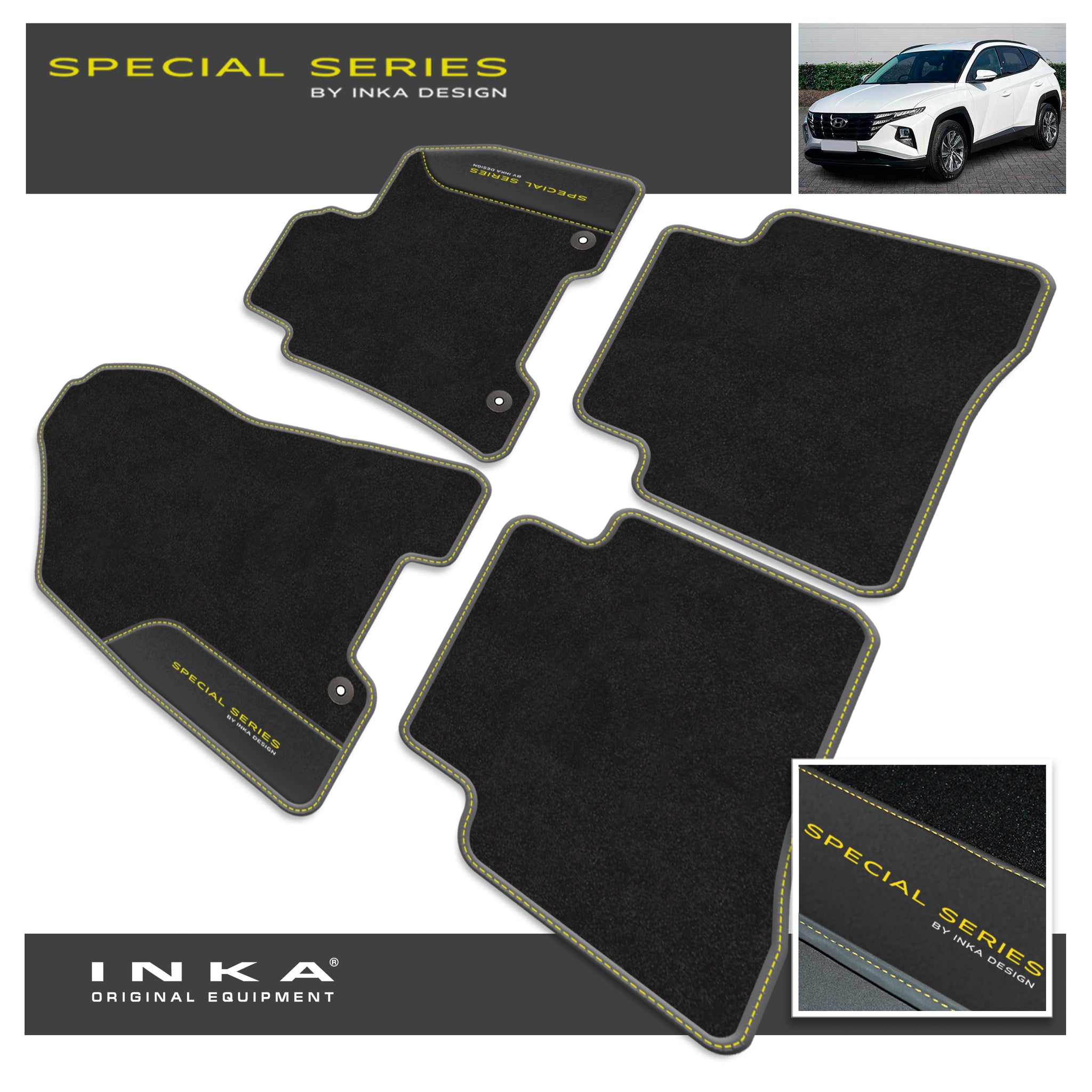 : This Item Can Be returnedHyundai - Tucson - MY15-19 Onwards - Tailored Car Mat Set (Front & Rear 4pcs) In OEM grade carpet pile with black piping & Contrast Stitching - With SPECIAL SERIES EMB