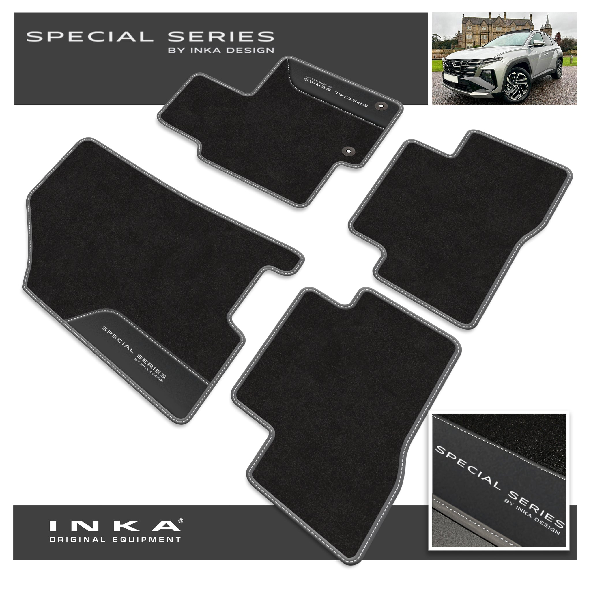 : This Item Can Be returnedHyundai - Tucson HEV - MY2020 Onwards - Tailored Car Mat Set (Front & Rear 4pcs) In OEM grade carpet pile with black piping & Contrast Stitching - With SPECIAL SERIES EMB